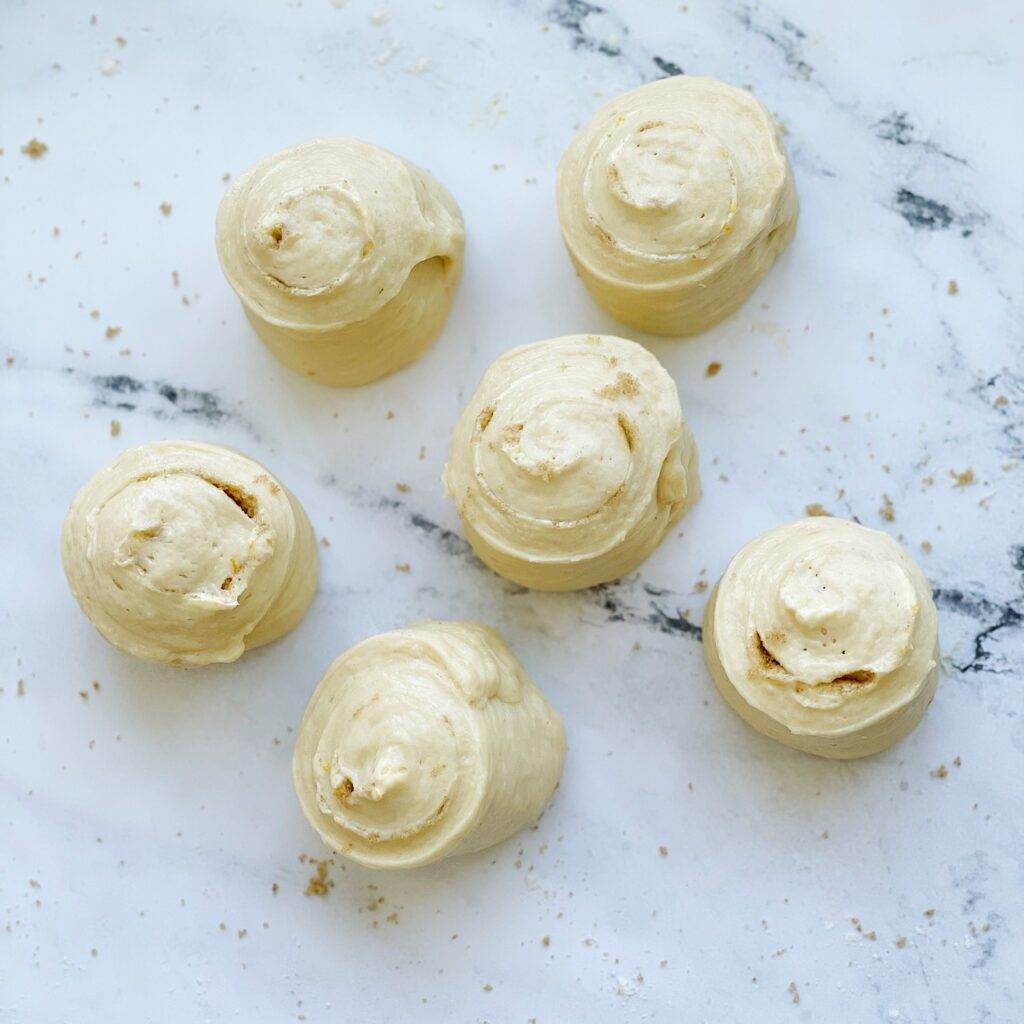 - Place rolls on a baking sheet sprayed with cooking spray or lined with parchment, about 1-2 inches apart. With your rubber spatula, smear a small amount of orange butter on top of the rolls and sprinkle with a small amount of brown sugar. Cover with clean kitchen towel for about 45 – 60 minutes, or until they at least double in size.