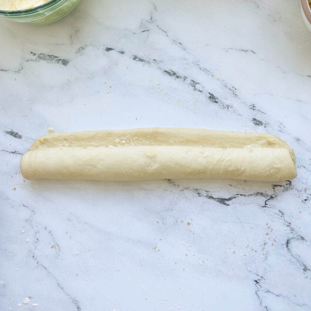 - Start with the long side closest to you, and working from left to right begin to roll dough up. You can tug and pull as you go which will tighten the roll and make more swirls.