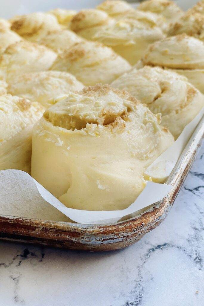 The second rise happens after you have shaped the rolls and place them onto the pan. This is called “proofing”. The second rise will usually take about half of the first rise time. Your beautiful homemade orange rolls will puff up to double in size at this point, usually taking about 45 minutes.