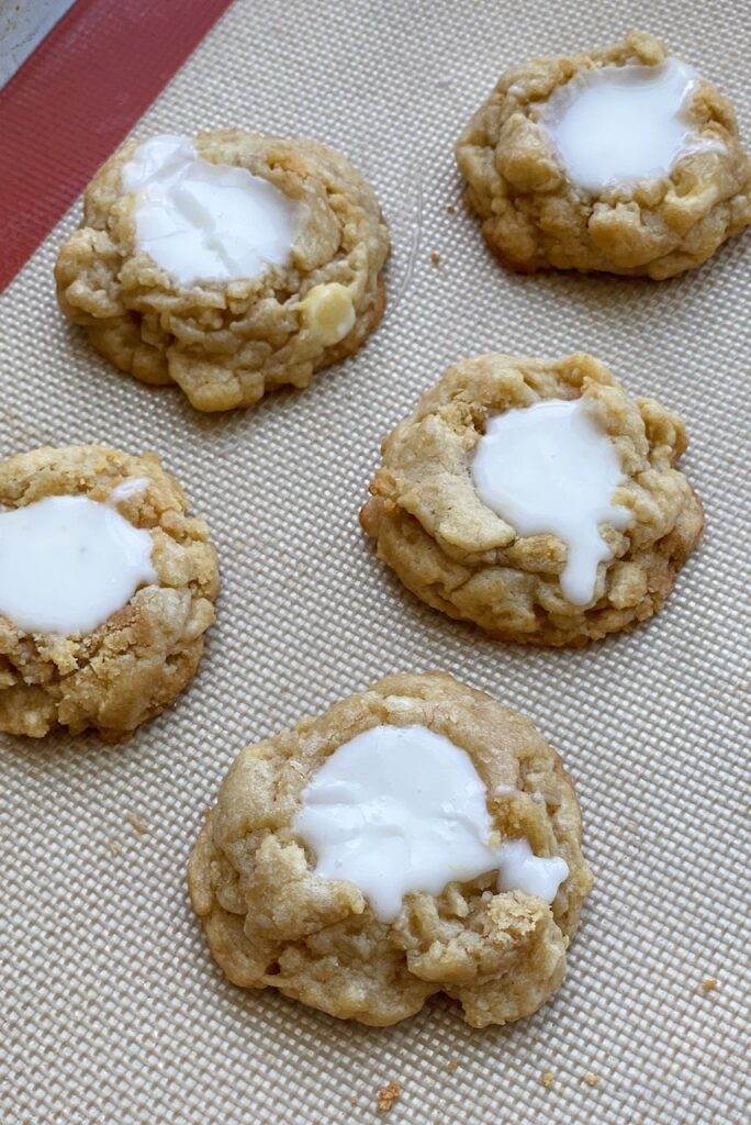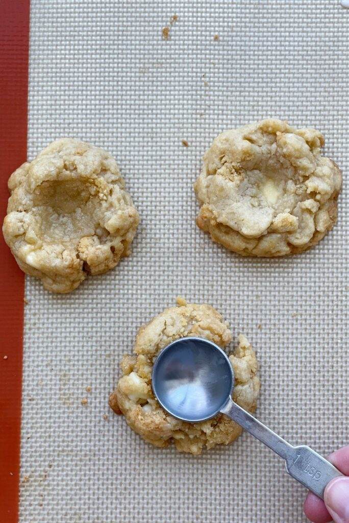 - Remove from oven and use the back of a teaspoon to create a well in the center of each cookie.