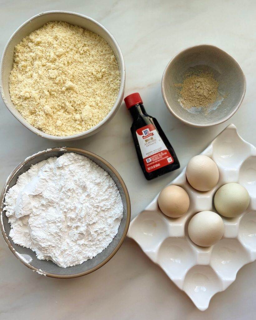 - Mix the dough: To the bowl of a stand mixer, add almond flour, cardamom and powdered sugar. Mix until they’re fully combined. Next add egg whites and almond extract and mix until smooth, about 2-3 minutes. The dough should feel very soft and slightly sticky.