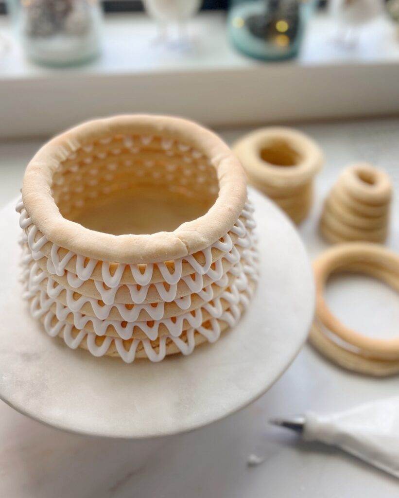 - Assembling the Kransekake: Group similar sized rings together to keep you organized as you assemble. Starting with the largest ring, pipe the royal icing around the top in a zig zag pattern. Top with the next largest ring, ice and repeat until all 18 layers have been stacked.