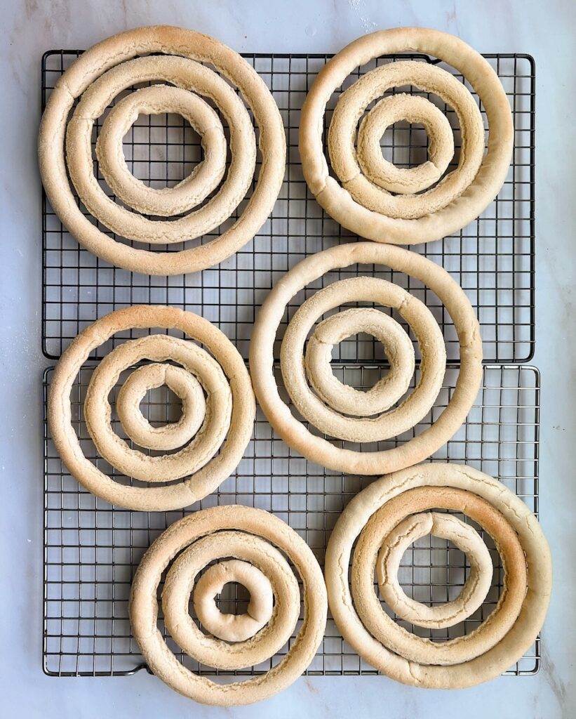 Flip the parchment over, so that the pencil or marker is on the underneath but still visible. Arrange the dough in the specified sizes. You can save space by nesting smaller rings inside larger ones. Be sure that they are at least 2 inches from each other.