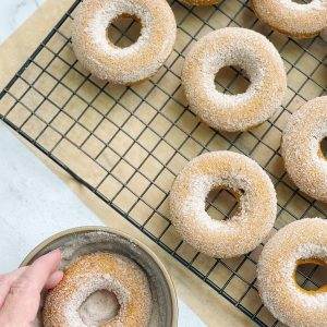 - Coat the baked doughnuts in cinnamon sugar while they are still warm. Let them continue to cool on the wire rack…or for a more amazing pumpkin spice doughnut experience, eat them while they are still warm!