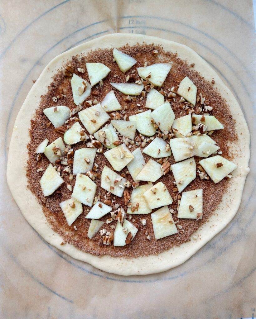 - Spread melted butter onto the surface of the dough, leaving a 1-inch border around the edges. Sprinkle on half of the cinnamon sugar filling, maintaining the 1-inch border around the edge. Sprinkle on half of the chopped apples and half of the chopped pecans. Slide parchment aside.