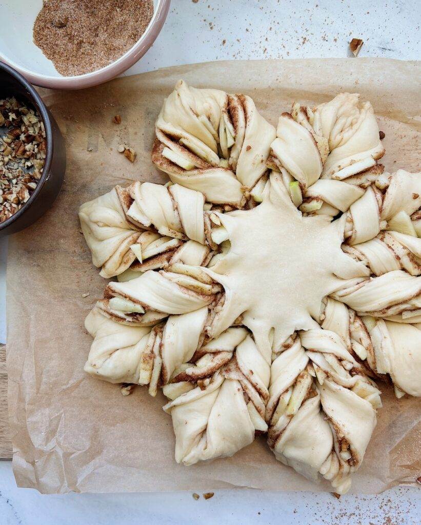 - While your dough is rising, you can get your filling ready. In one bowl, combine the sugars, cinnamon and nutmeg. Peel, core and slice the apples. Then, cut the apple slices in half or thirds – these thinly sliced apple chunks make it easier to twist the dough later when you shape your star bread. After your dough has risen, divide it into three equal pieces. Each piece should weigh about 10 ounces.