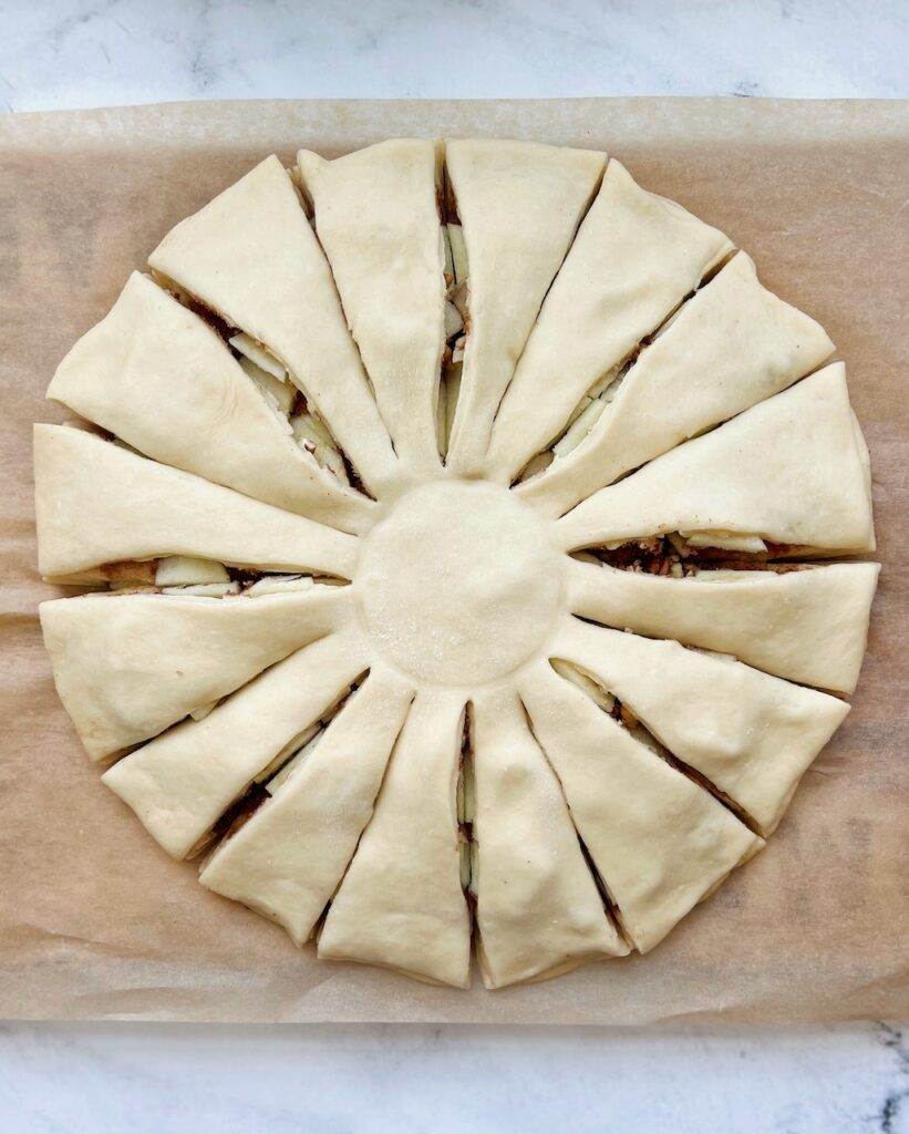 - Place a 3-inch round cookie cutter or small mason jar in the center of the dough. Using a pastry cutter or sharp knife, cut the dough into quarters. Cut each of those in half and cut each of those in half again – creating 16 total equal strips of dough, connected at the center.