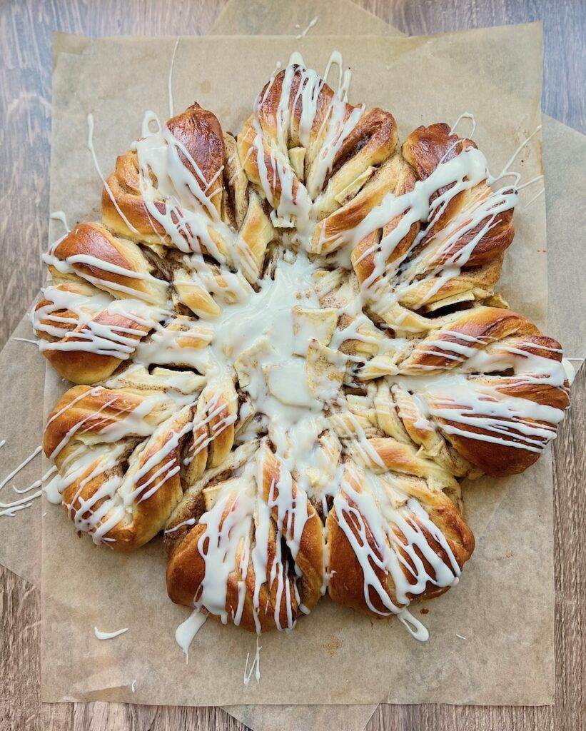 - In a small bowl, whisk together the ingredients for the Maple Icing, adding enough powdered sugar to make it a thick enough consistency that it has a steady stream when drizzled. Drizzle on top of the star bread, from side to side. Let icing set about 10 minutes before serving.