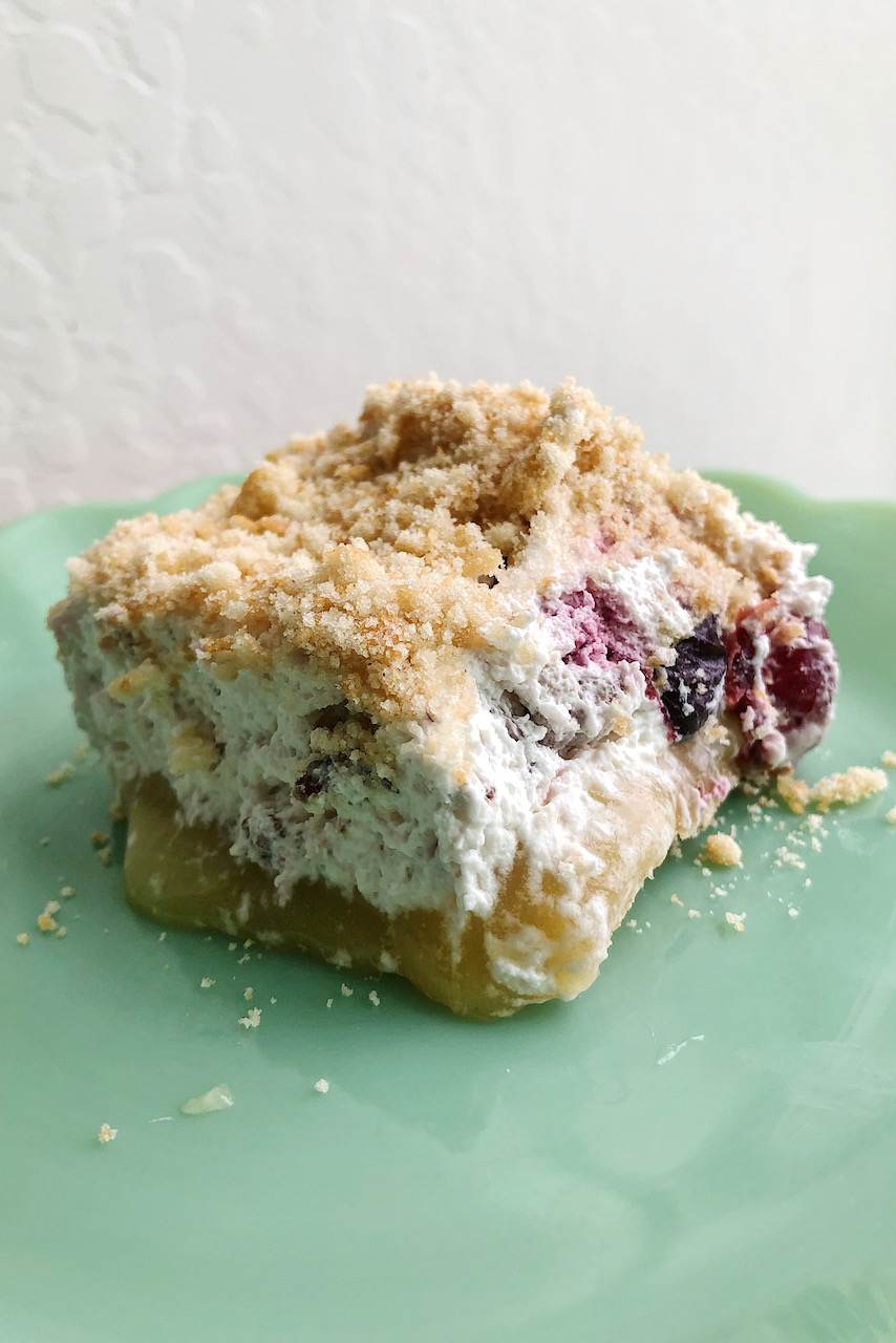 This beautifully layered dessert has several delicious layers that all compliment each other. Sweet mixed with tart. Crunchy mixed with fluffy. Every bite gets better and better!