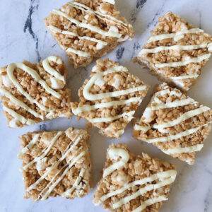 Quick and easy, no bake, pumpkin spiced treats! These Rice Krispies Treats are packed full of Fall spices and include crushed up ginger snap cookies, chunks of marshmallows and a white chocolate drizzle! They’re the perfect Fall treat to make when you’re in a time crunch, but want something really yummy!