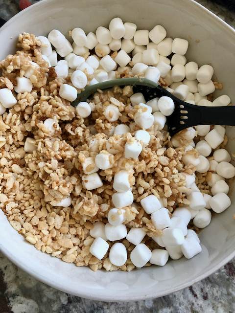 - Pour the marshmallow mixture into the large mixing bowl and toss with the Rice Krispies mixture. Keep stirring until it’s all coated.