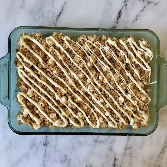 - In a microwave safe bowl, microwave the white chocolate chips in 30 second increments, stirring each time. It should only take a couple of minutes to melt it completely. Put in piping bag or zip top bag and snip the corner. Drizzle in a back and forth motion over the Rice Krispies Treats.
