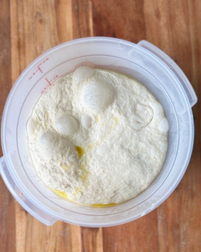 - Once you transfer the mixed dough to an oiled container, cover and let it rise until doubled in size (about 2 hours).