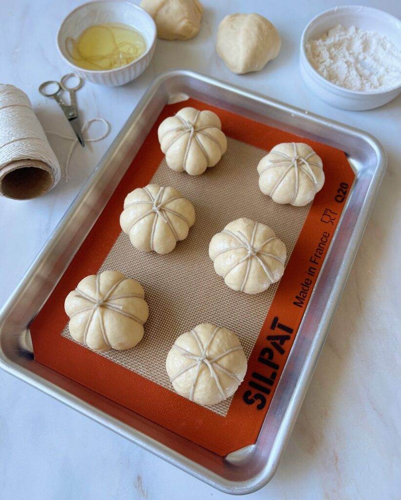 Using baker’s twine will allow you to make these festive pumpkin shaped dinner rolls. Be sure to use a twine that is meant for cooking (don’t use a rough, jute twine). I like to use this twine found HERE.
