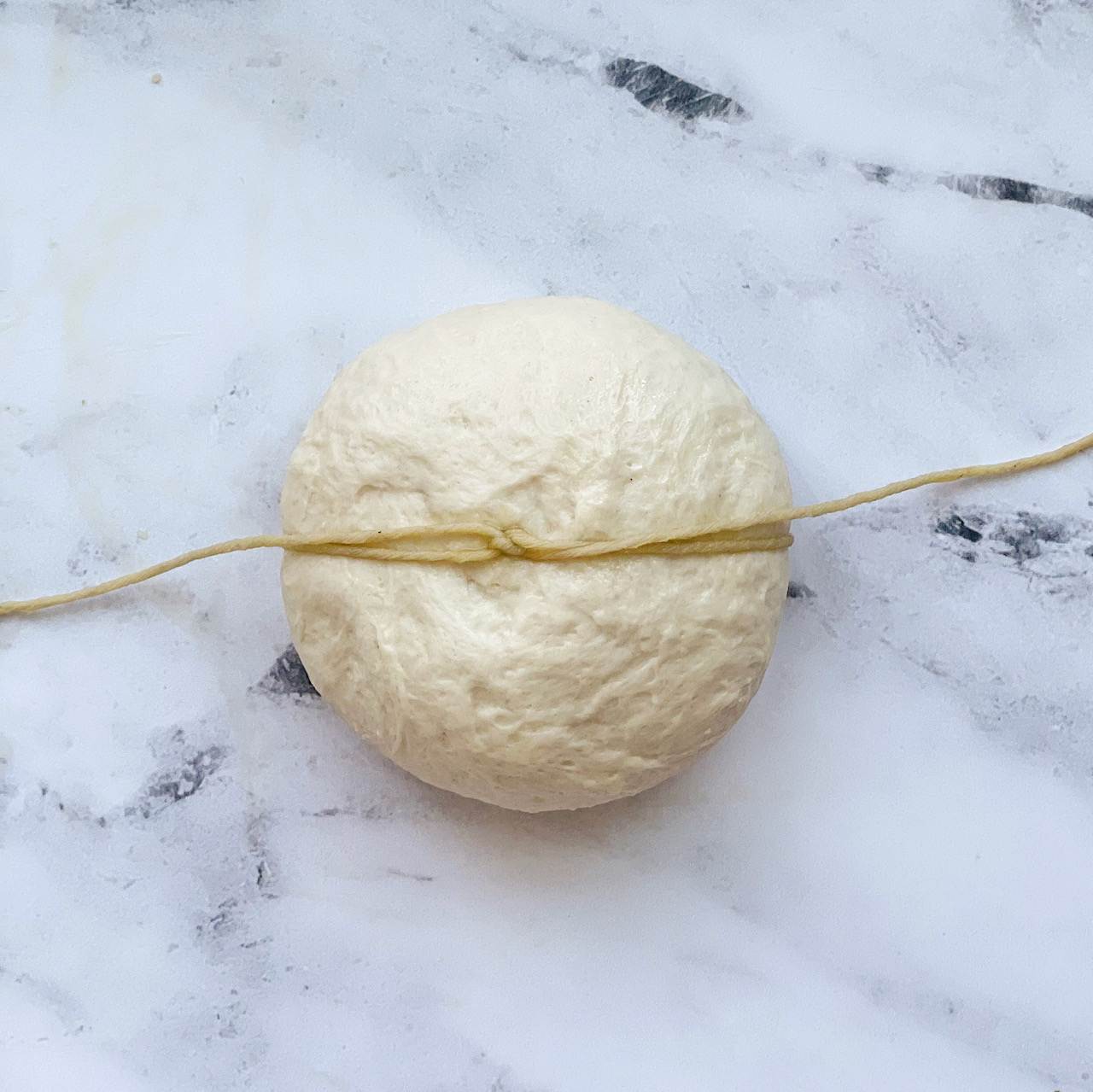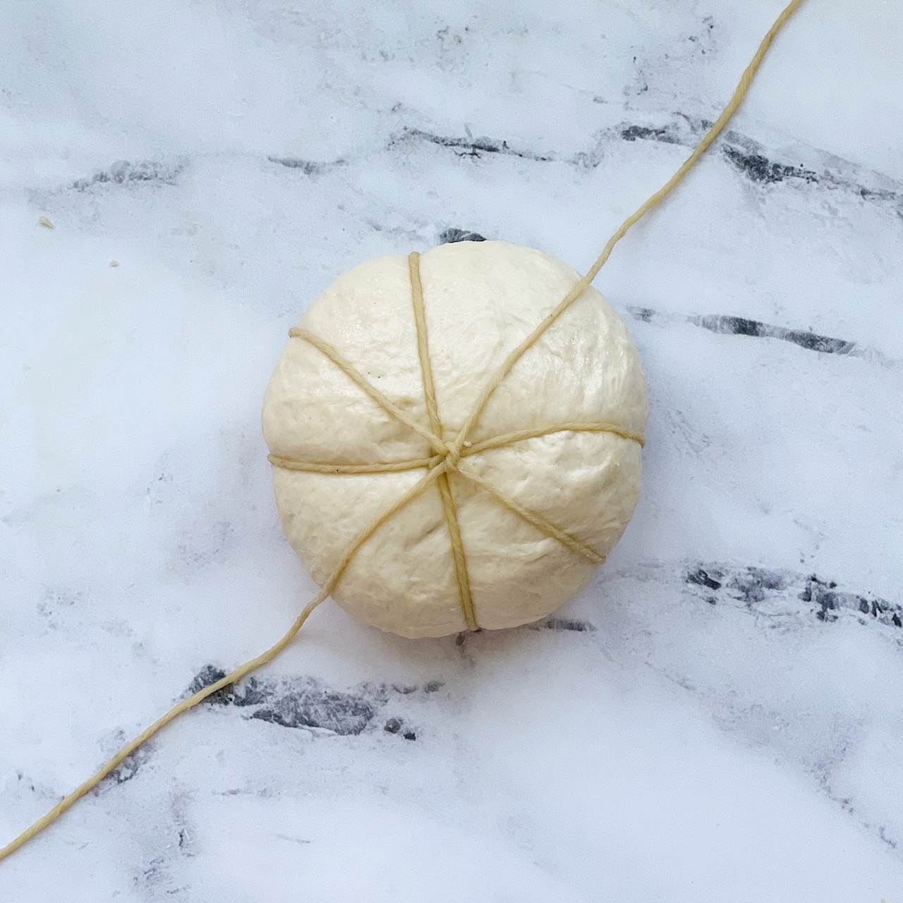 - Wrap the dough: Find the middle of the piece of twine and place it over the center of the dough ball horizontally. Flip the dough over and bring the ends of the twine together. Tie a double knot in the center of the dough ball, making sure not to pull the twine too tightly around the dough. Take the ends of the string and arrange them vertically (in the opposite direction as the twine you just double knotted). Flip the dough back over, bring the ends up and tie another double knot in the center, loosely wrapping the twine around the dough. Arrange the ends of the twine diagonally, flip the dough over and bring the ends together. Tie a double knot. Arrange the ends of the twin diagonally in the opposite direction. Flip the dough over and bring the ends together, tying a double knot again in the center. Cut off the excess string. You should now have a dough ball that is wrapped with twine, creating eight sections.