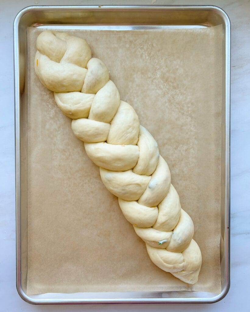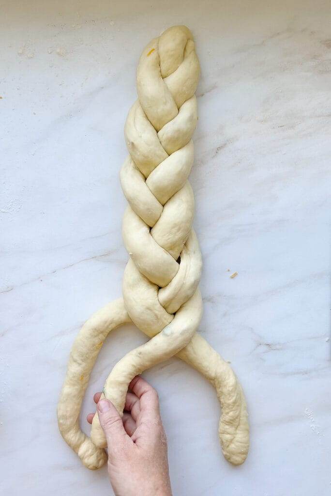 - Braid the bread and pinch the loaf together at each end to seal the three strands together.
