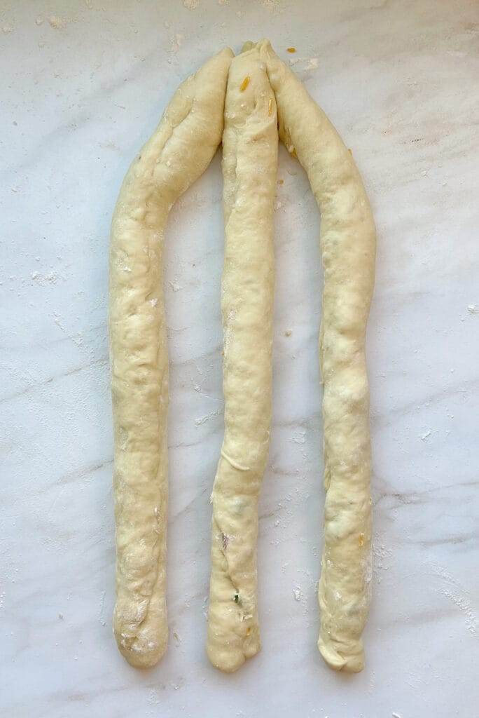 - Carefully roll up each strip of dough lengthwise. Pinch the seams of the dough shut to keep it from opening. You’ll end up with three long ropes of filled dough.