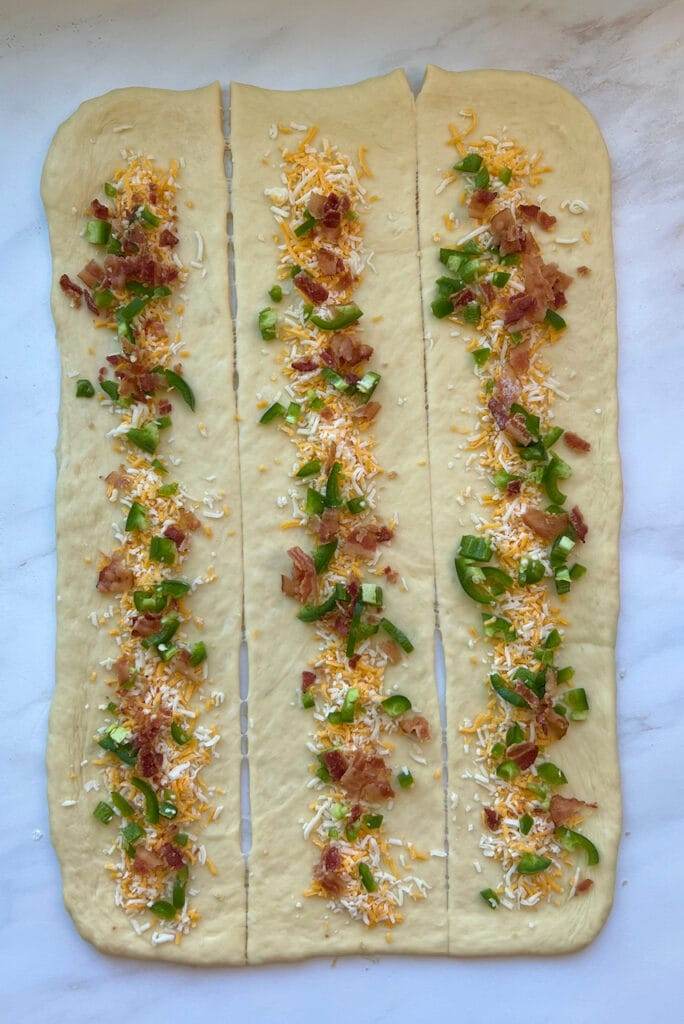 - Layer the cheese, jalapenos and bacon in three rows along the length of the dough. Each row should have a two-inch border. With a pizza cutter, cut the dough between each row of filling. You’ll make two cuts, dividing the dough into three strips.