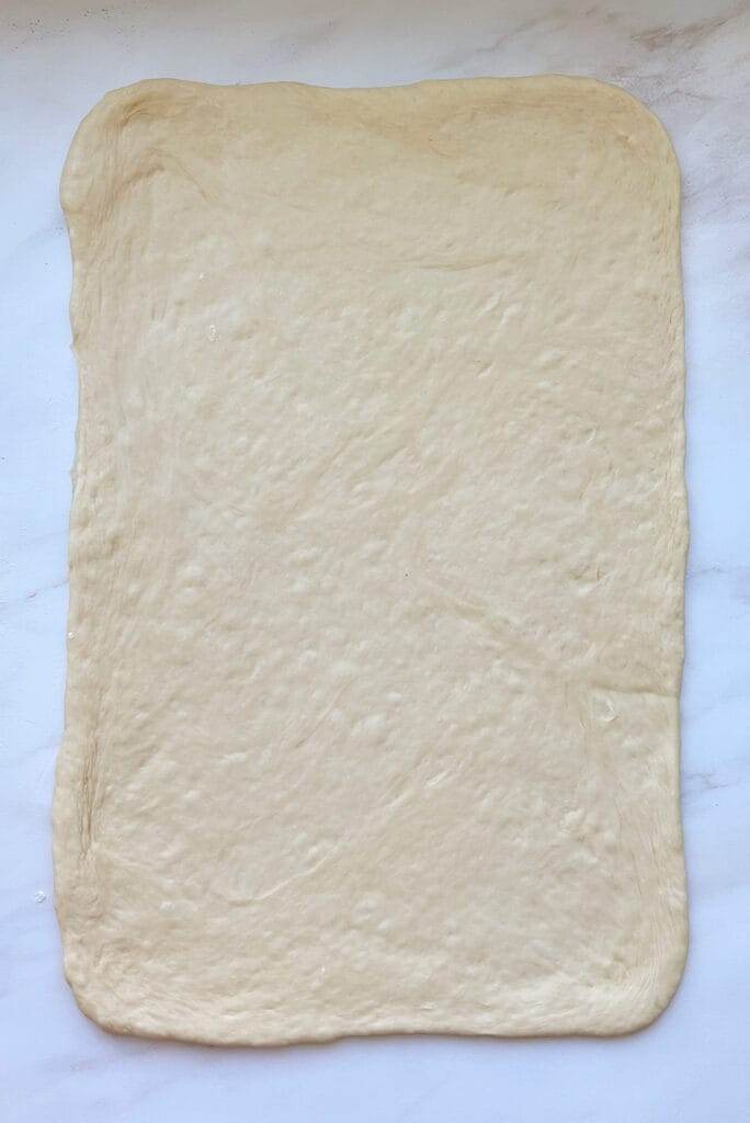 - Deflate dough and place on lightly floured work surface. Roll out to a rectangle about 16×20-inches in size.