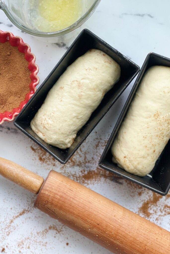 - Roll out each dough ball into a rectangle, just a bit more narrow than your bread pan. The dough should be 1/4 inch thick. Brush with melted butter, leaving a one inch clean border on the end. Sprinkle a generous amount of cinnamon sugar mixture, again leaving a one inch clean border at the end. Roll up the dough, tucking and tightening as you go and ending at the edge with the clean boarder. Gently pull up the dough over the loaf and pinch the seam closed. Place in the greased bread pans with the seam side down. Cover with a towel and let rise until doubled in size. The bread should not rise more than two inches above pan level.