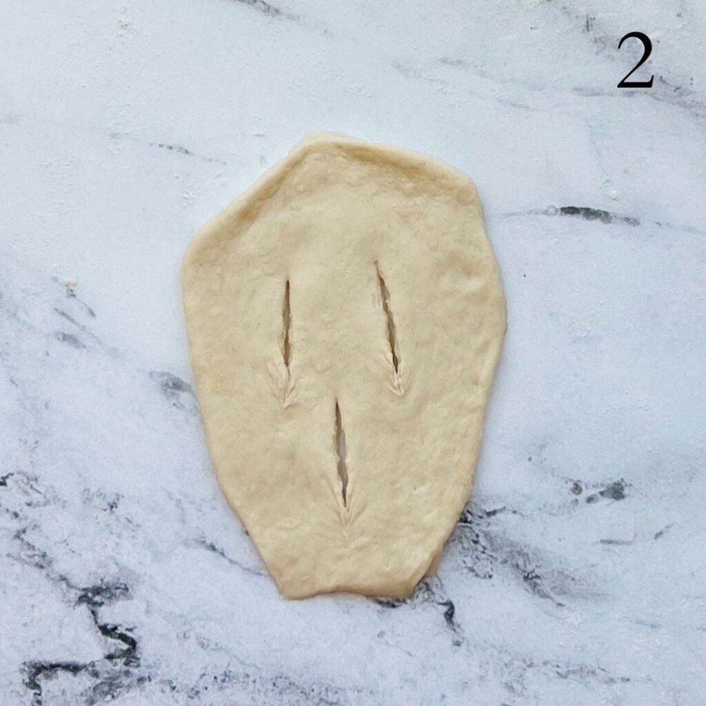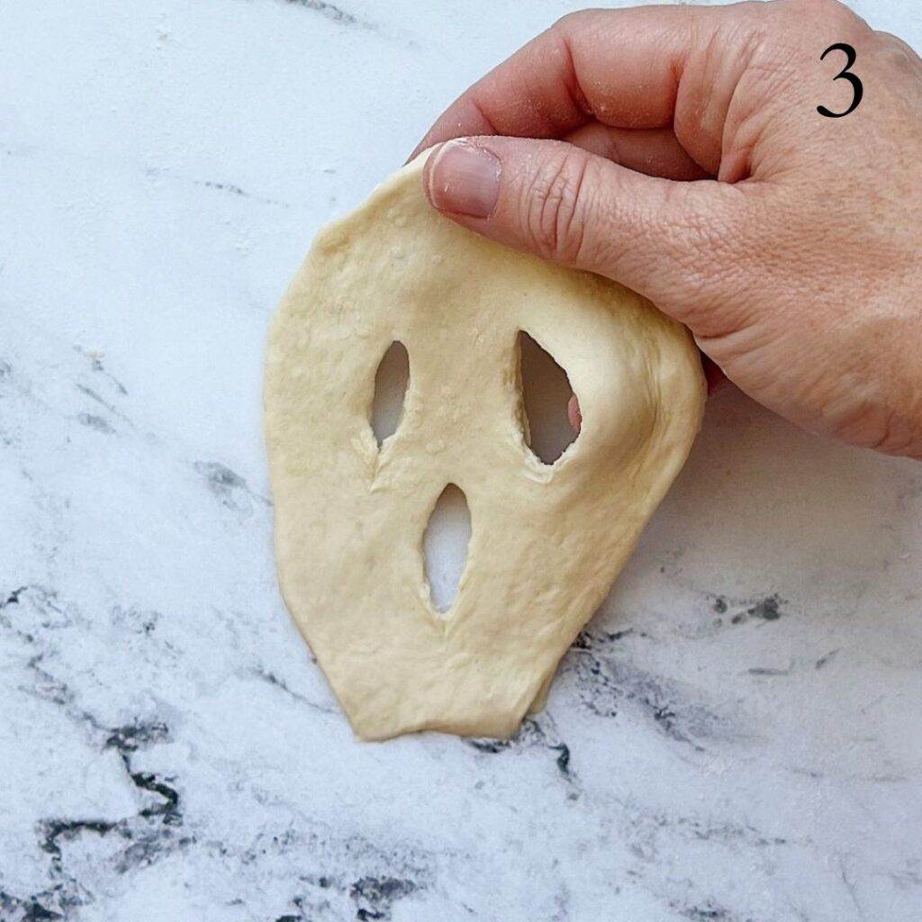 - Divide the dough into 12-18 equal pieces, depending on how big you want your ghosts. Roll each into an oblong ghost shape, about 4-6 inches long. With a pizza cutter or sharp knife, cut three 1-inch slits for the eyes and mouth. Lift the dough off of your work surface and gently enlarge the three holes by stretching out with your fingers.