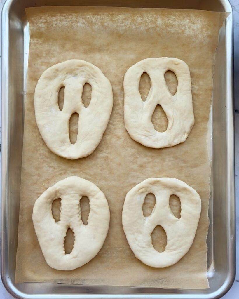 Making mini fougasse that resemble ghosts are just a no brainer! A full size fougasse can be so intricate and unique, but these minis could not be easier to make! This fun, artistic bread is such an easy way to create a ghost shaped side of bread!