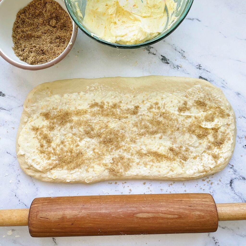 - Spread the orange butter on the dough, leaving an inch border on the top side of the rectangle. Reserve some of the orange butter for the tops of the rolls. Sprinkle about 1/4 – 1/3 cup of brown sugar on top of the orange butter, continuing to leave the inch border at the top edge. Leaving this border will help in sealing the dough shut when rolled up.