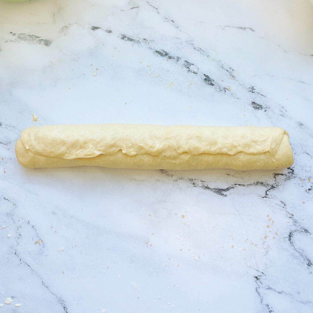 - Start with the long side, closest to you and working from left to right begin to roll the dough up. You can tug and pull as you go which will tighten the roll and make more swirls.