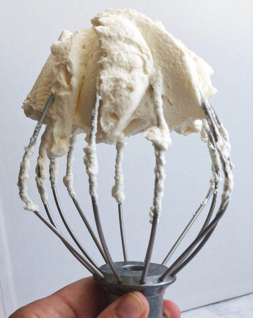 Beat heavy whipping cream in an electric mixer with the vanilla and powdered sugar. They will slightly sweeten the cream. I prefer to use powdered sugar instead of granulated sugar – it contains cornstarch, which stabilizes the whipped cream. Every cup of cream you beat, will yield 2 cups of whipped cream. My kids LOVE whipped cream, so we always make plenty!
