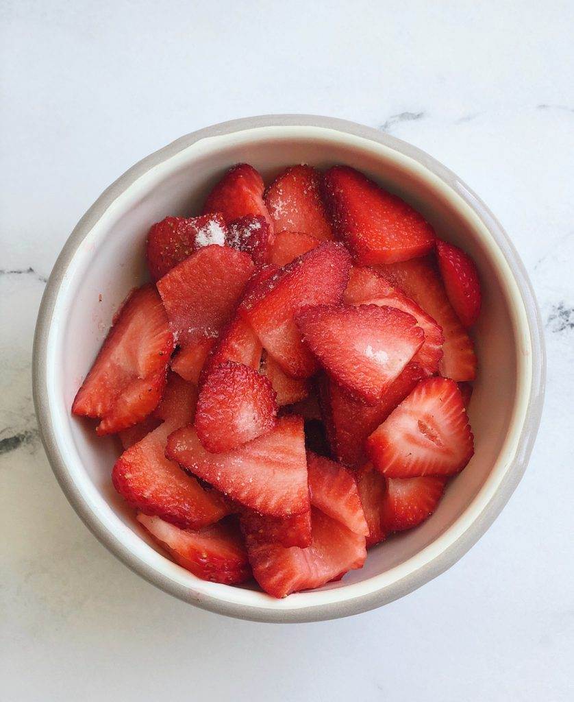 - In a separate bowl, combine the sliced strawberries and granulated sugar. Cover and refrigerate until ready to use. The sugar will macerate the strawberries, softening them and forming a sweet syrup!