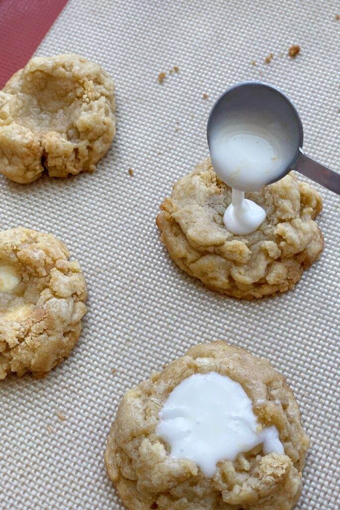 - Right after the cookies come out of the oven and are still warm, create a well with the back of a teaspoon. This is similar to creating a “thumbprint cookie”. Creating this well will keep the icing in the center of the cookie without it running down the sides. Immediately spoon the icing into the well and let it set as the cookie cools. It makes such a pretty cookie that’s easy to serve and eat! You’ll love biting into the center and getting that rich lemon sour cream icing with a bite of cookie!