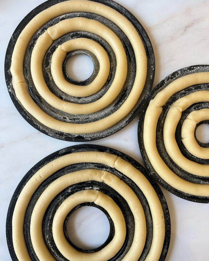 - Fill the pans: Lay the ropes into the ring molds. Pinch the ends together and smooth the dough out to hide the seam. If you run out of dough before filling all of the pans, you have rolled out your dough too thick. You can remove some of the ropes, roll them out a bit thinner and you’ll get more dough to complete your 18 rings. As you fill the rings, gently rest the rolled up dough into each ring form. Break the dough as needed to fit the pan. You can also piece short pieces of dough together to fit into the rings of the pans – simply pinch the pieces together and slightly roll to smooth out the seams.
