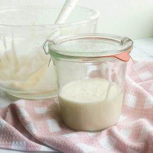 Simply combine equal parts of each and whisk together until smooth. The result will be a white, creamy looking mixture. Brush it onto every nook and cranny of your bundt pan.