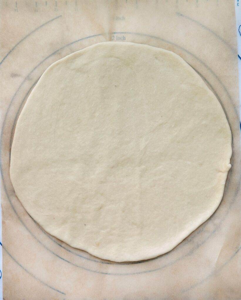 - Roll out the first piece of dough into a circle about 11 inches in diameter. (Silicone Pastry Mats are perfect for this!) Transfer to a piece of parchment paper (To easily do this, flour the dough, fold it in half. Flour the top and fold it in half again. Lift it up and transfer to parchment and unfold.). Once on the parchment paper, if the dough sprung back a bit, use rolling pin to roll it back out to 11-inches.