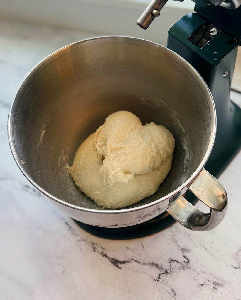 - Make the dough: Simply add all of the dough ingredients to the bowl of your stand mixer. Turn it on and let it mix and then knead for 6 minutes. By the time the gluten develops the dough, it should be pulling away from the sides of the bowl. Place your dough in a greased bowl, cover it and let it rise until doubled in size. Depending on how warm your kitchen is, this could take anywhere from 60-90 minutes. *If you want to make this ahead of time, refrigerate the dough after mixing and let it slow proof in the refrigerator overnight – roll it up and bake the next morning.