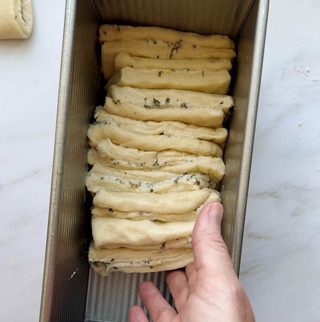 - Fold each piece in half and place them upright in the pan with the folded side down, resting inside the pan. You’ll need to push them close together to fit them all in. Work quickly as this bread dough rises pretty fast.