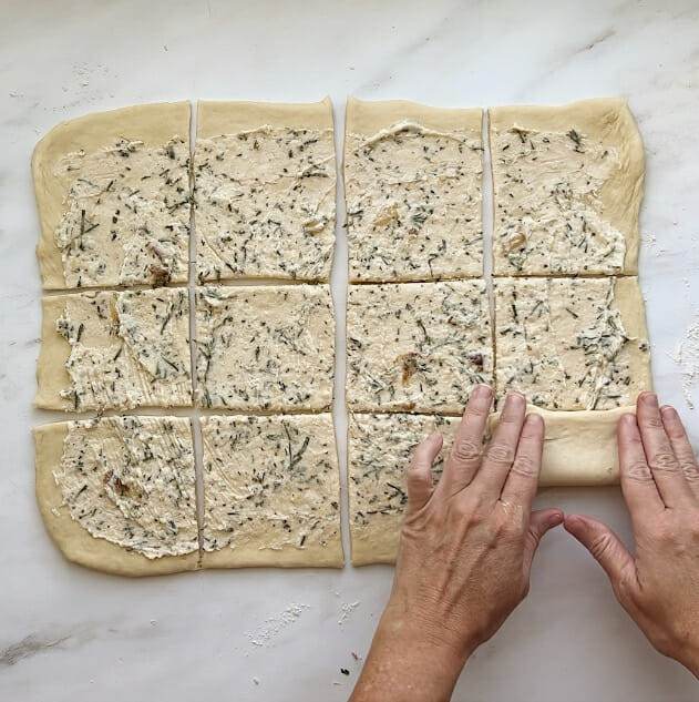 - Cut the dough into 12, 4-inch squares. Fold each square in half and place side-by-side in loaf pan.