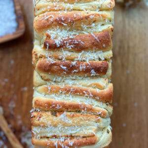 This is not your ordinary garlic bread. Baked in a loaf pan, the easy pull apart layers make it the perfect side to any meal. Serve it fresh out of the oven, let everyone pull off their own piece to enjoy.