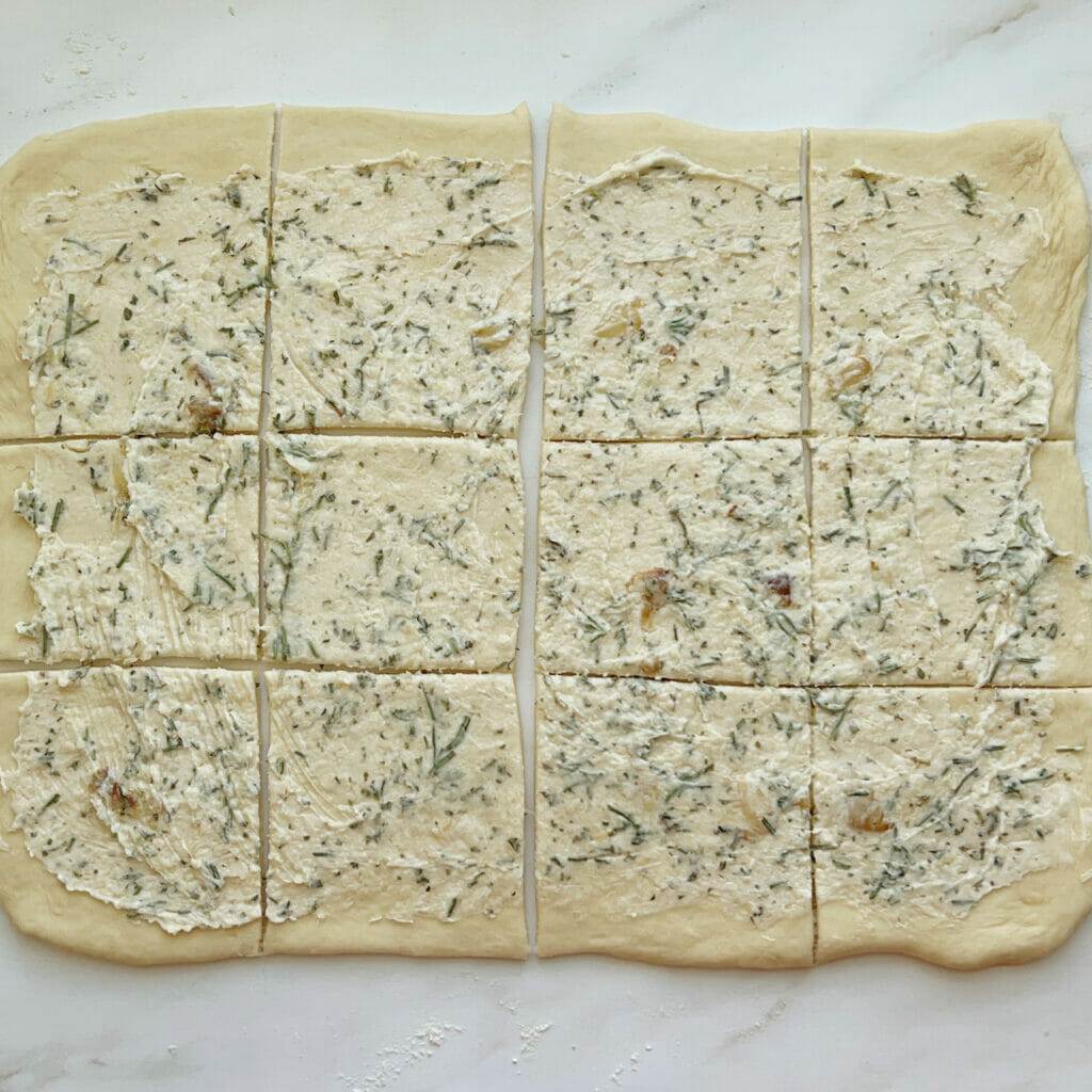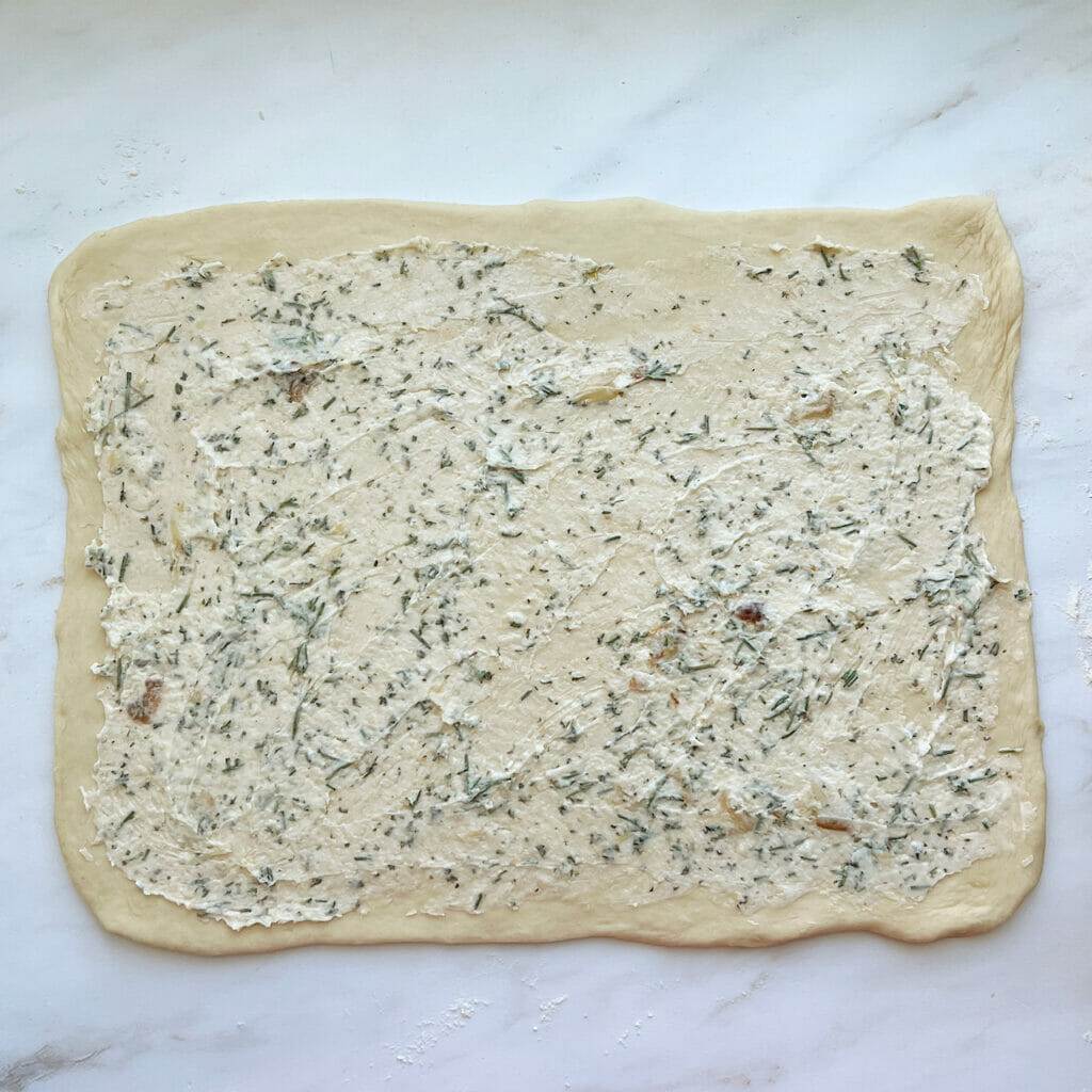 - With a rolling pin, roll the bread dough into a 12×16 inch rectangle. Spread the butter mixture on top. Sprinkle the grated cheese over the butter.
