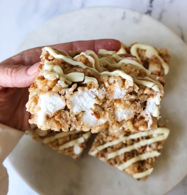 - Allow them to sit about an hour before slicing. This will let the white chocolate set and the Rice Krispies to firm up, making them easier to slice and serve.