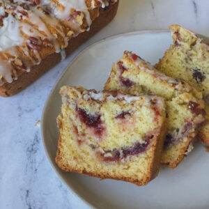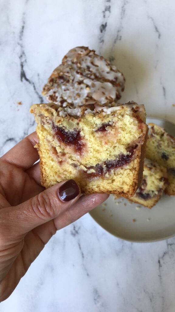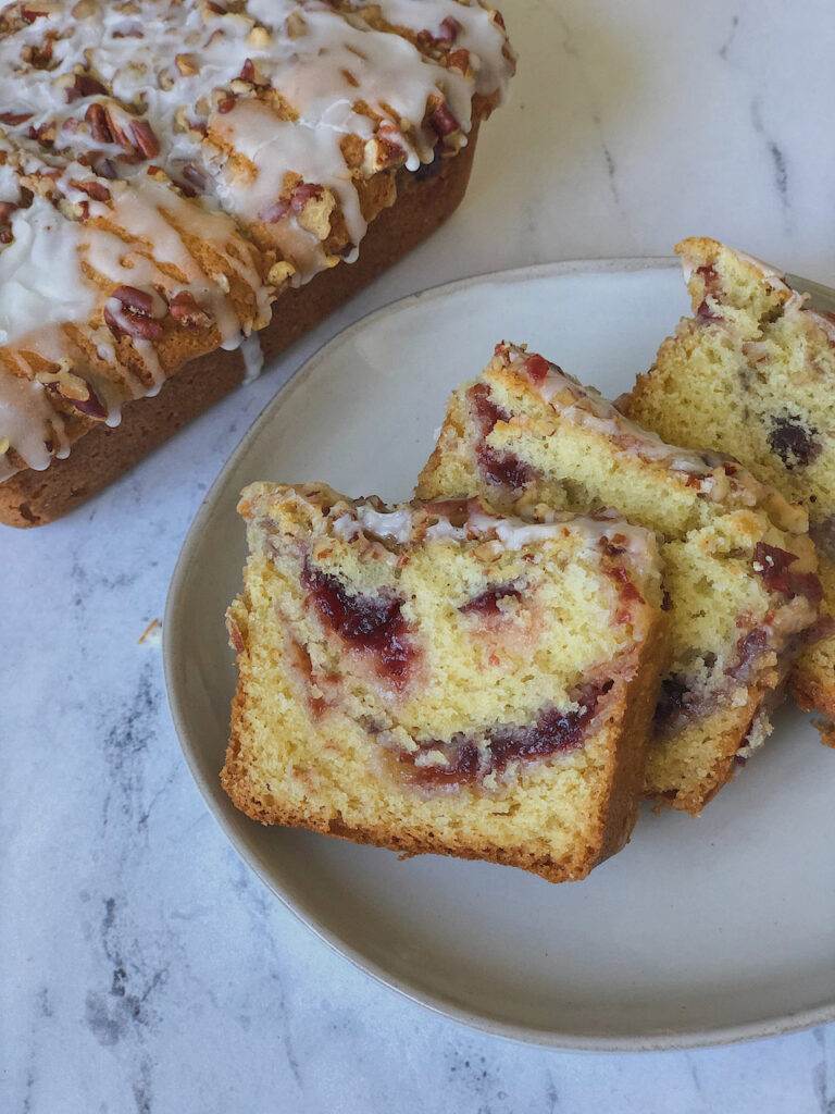 The Holidays would not be the same without this moist, delicious sweet bread. My mom makes her famous Cranberry Bread every Christmas and shares loaves and loaves with her lucky friends and neighbors. This fluffy bread is full of sweet cranberry sauce swirls and topped with a pecan glazed crust!