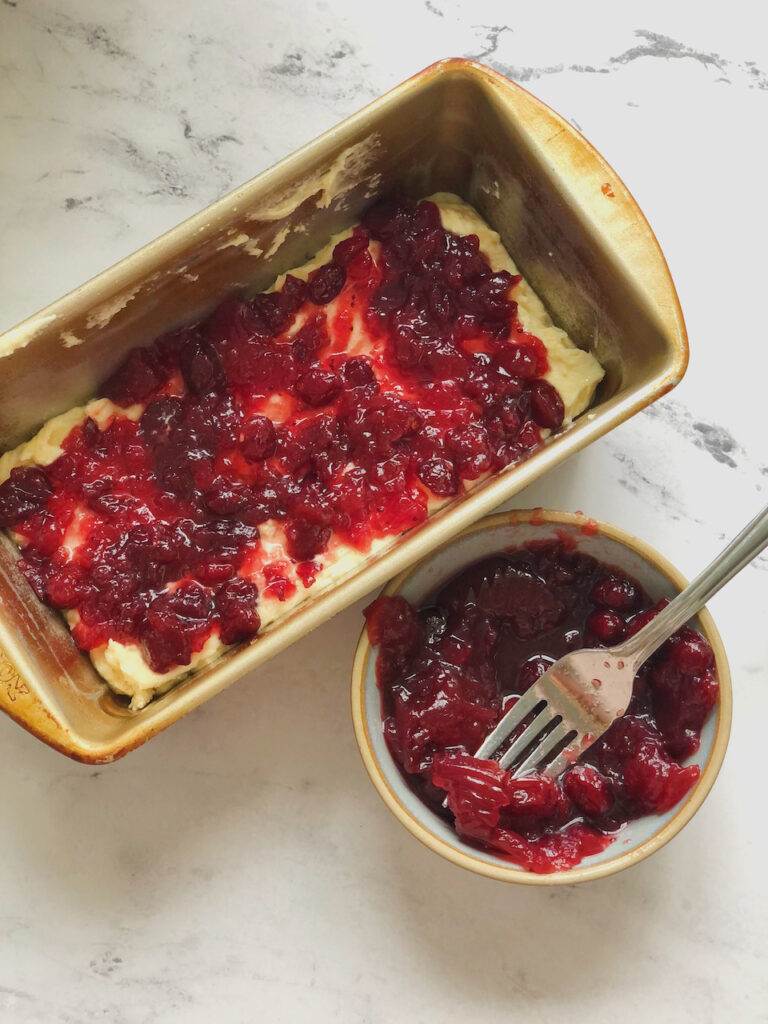 It’s really going to be so yummy in the bread. It’s got whole pieces of cranberry, mixed with a sweet sauce…perfect for layering with sweet bread batter!