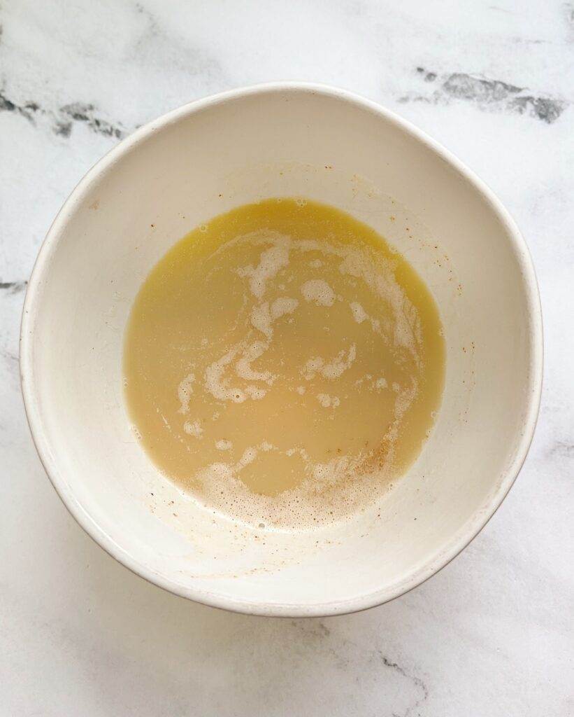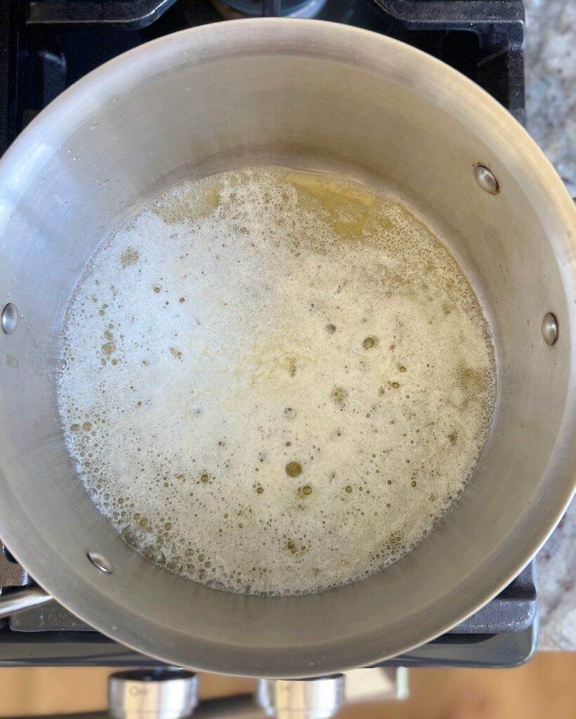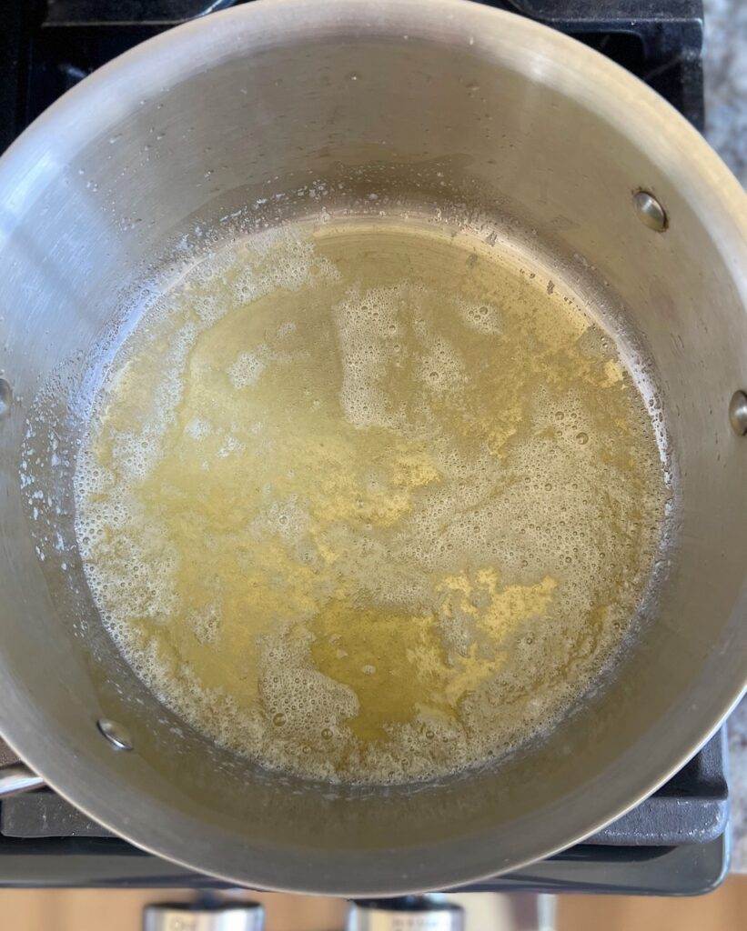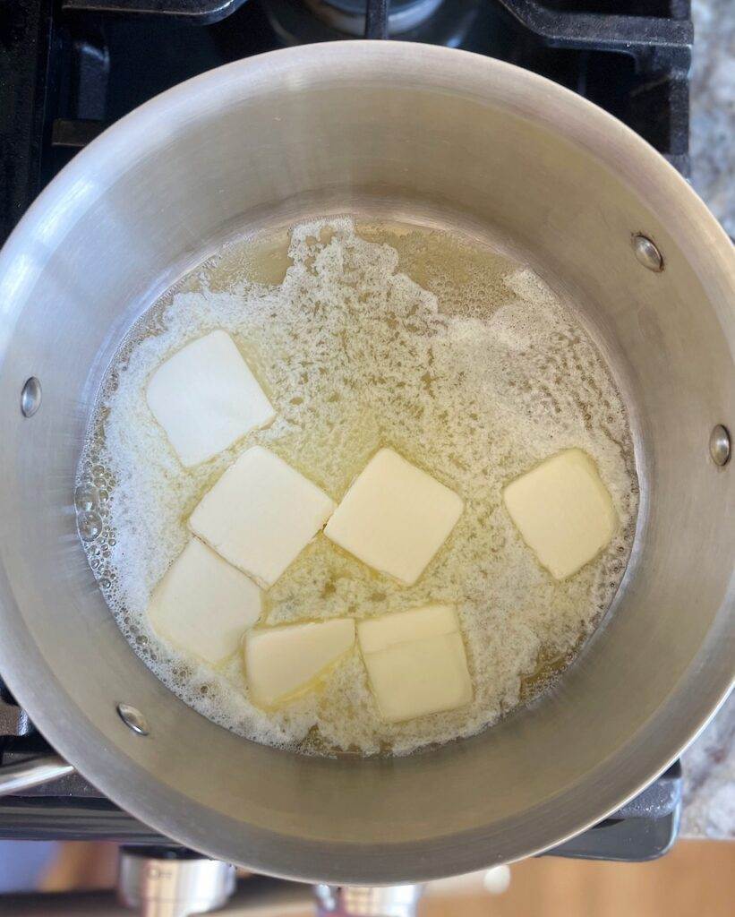 - Add the cubed butter to a small saucepan. Melt on low to medium heat. Allow it to come to a low simmer. Stir frequently to allow the butter to cook evenly. After about 4-5 minutes, you’ll see the butter start to brown and give off a slightly nutty aroma. Once you see small, golden-brown speckles, remove the pan from the heat. (Avoid over browning – you want a medium golden color)