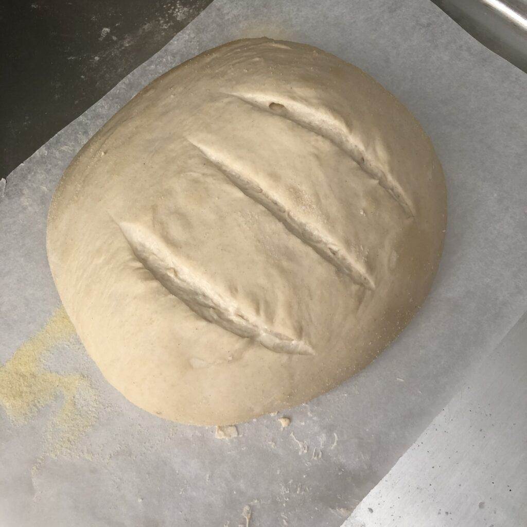 Form the loaf and let it rest. Before baking use a sharp serrated knife to make three slashes in the loaf. This will allow it to expand when it puffs up in the oven.