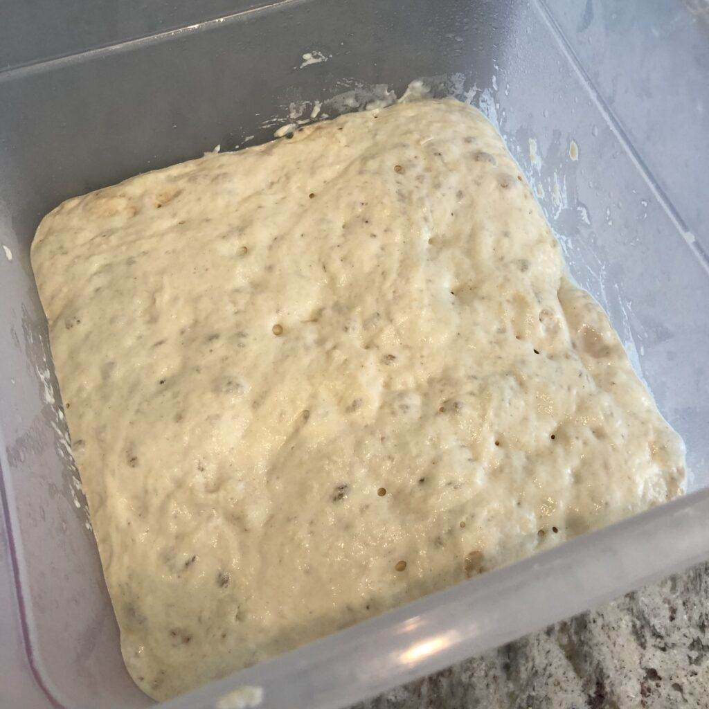 - Snap the lid on all the way and refrigerate over night. When you remove the dough after chilling, you may notice that it has fallen. That is totally normal. Use dough as needed. Keep in the refrigerator up to 2 weeks. The longer it chills, the more the flavor will deepen to more of a sourdough flavor.