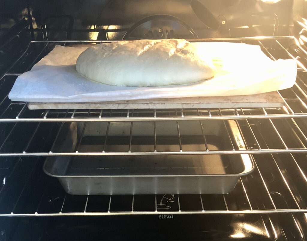 Baking on a baking stone gives this bread a nice crispy crust. A broiling pan on the bottom rack with an inch of water in it will create steam as it is baking. This is an important step because it helps the bread puff up in the oven and creates a flakier crust.