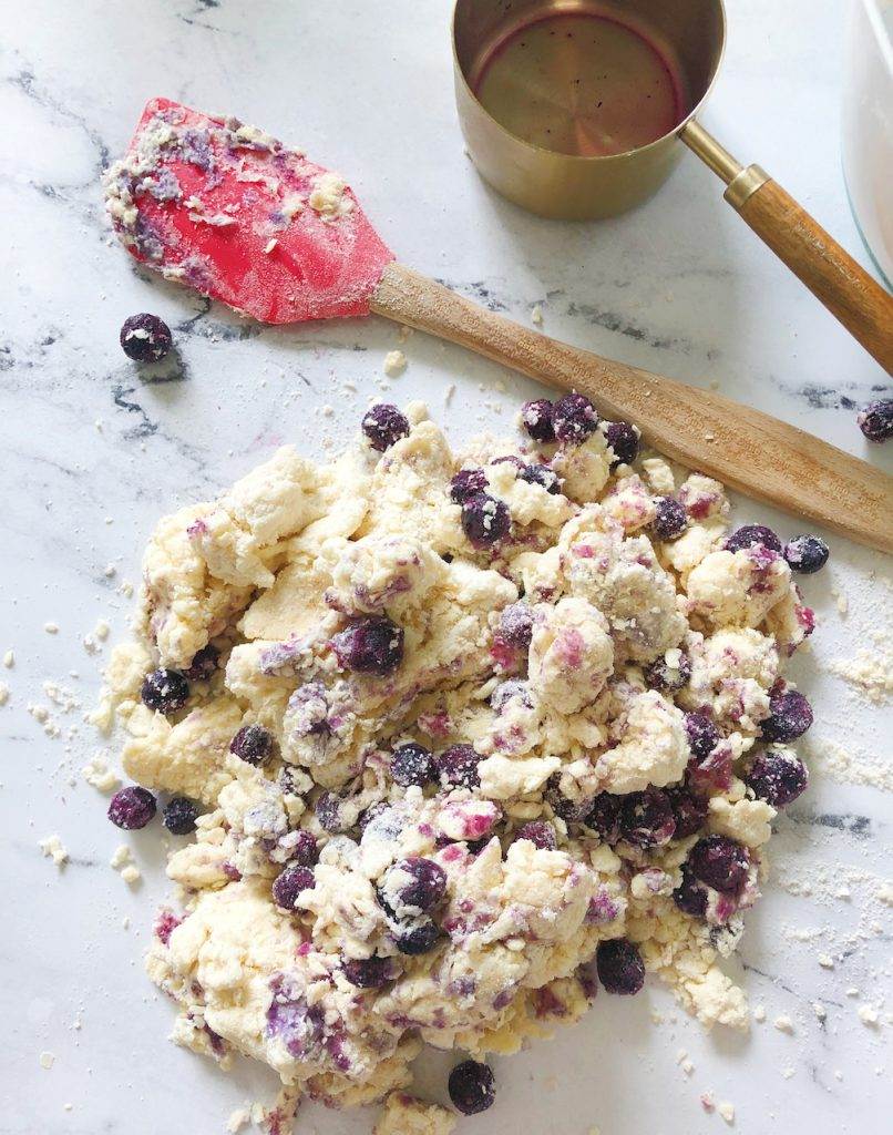 Since mixing these scones requires some work with your hands, using frozen blueberries will help to keep the blueberries from getting smashed and “bleeding” berry juices into the dough. You can definitely still use fresh blueberries – I’ve just found this process a whole lot easier when using frozen blueberries.