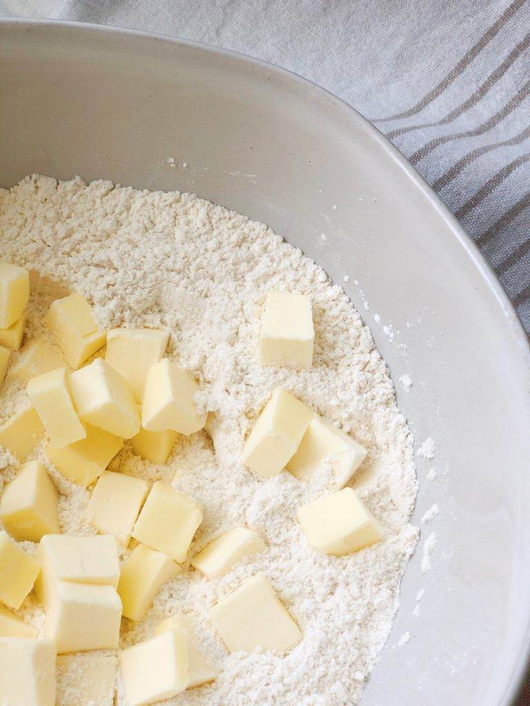 - Cube butter and place in freezer while preparing the rest of the ingredients. Keep in freezer no longer than 20 minutes. You want the butter to be chilled but not frozen.