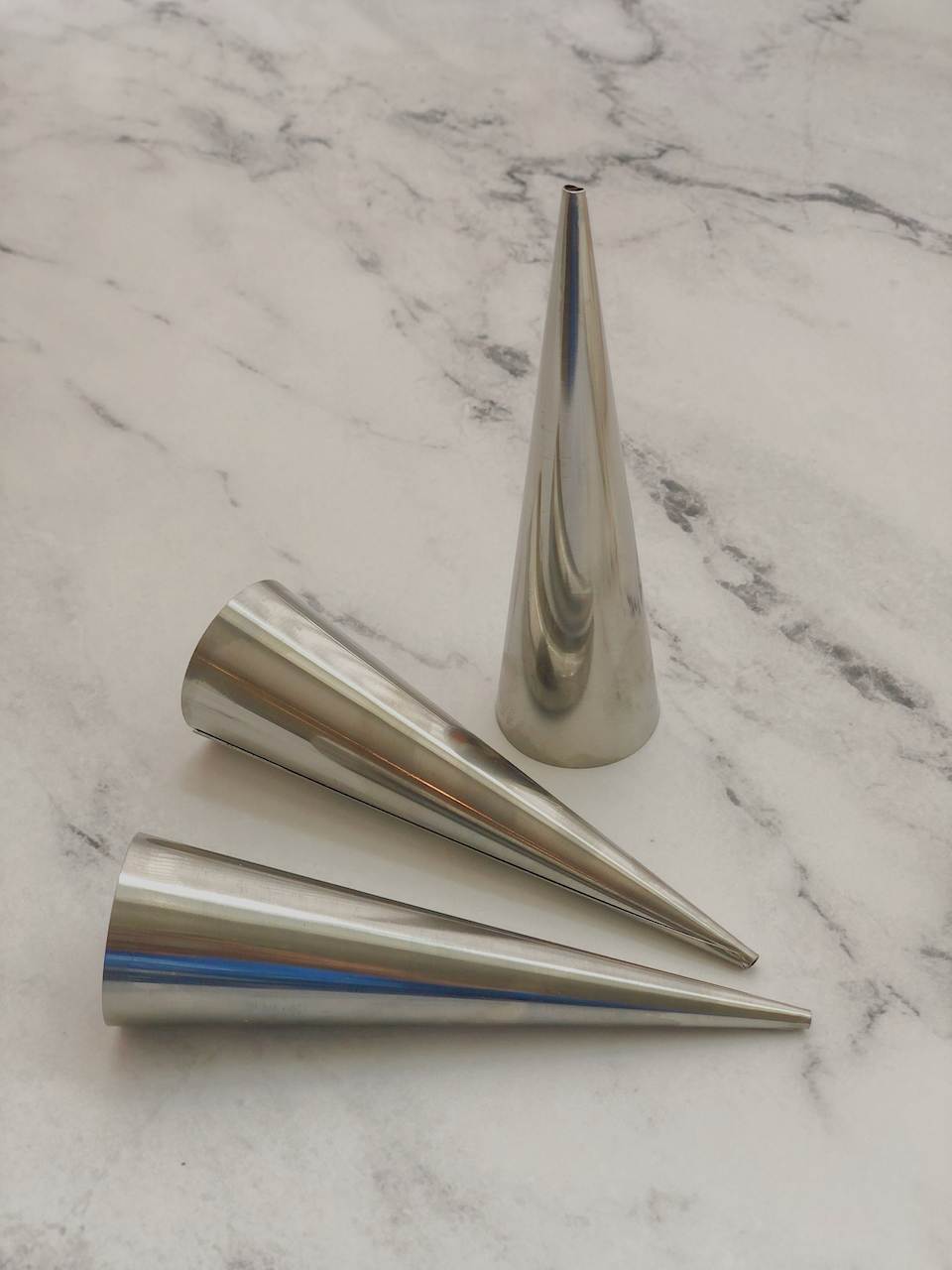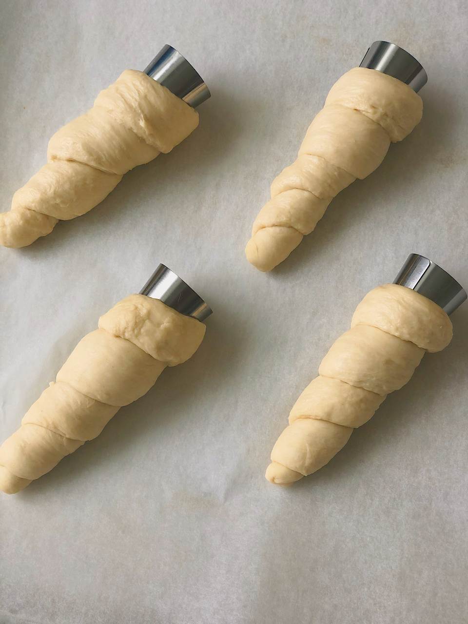 - Using a cream horn mold and starting at the tip, wrap the dough along the mold and pinch the dough at the end, sealing it