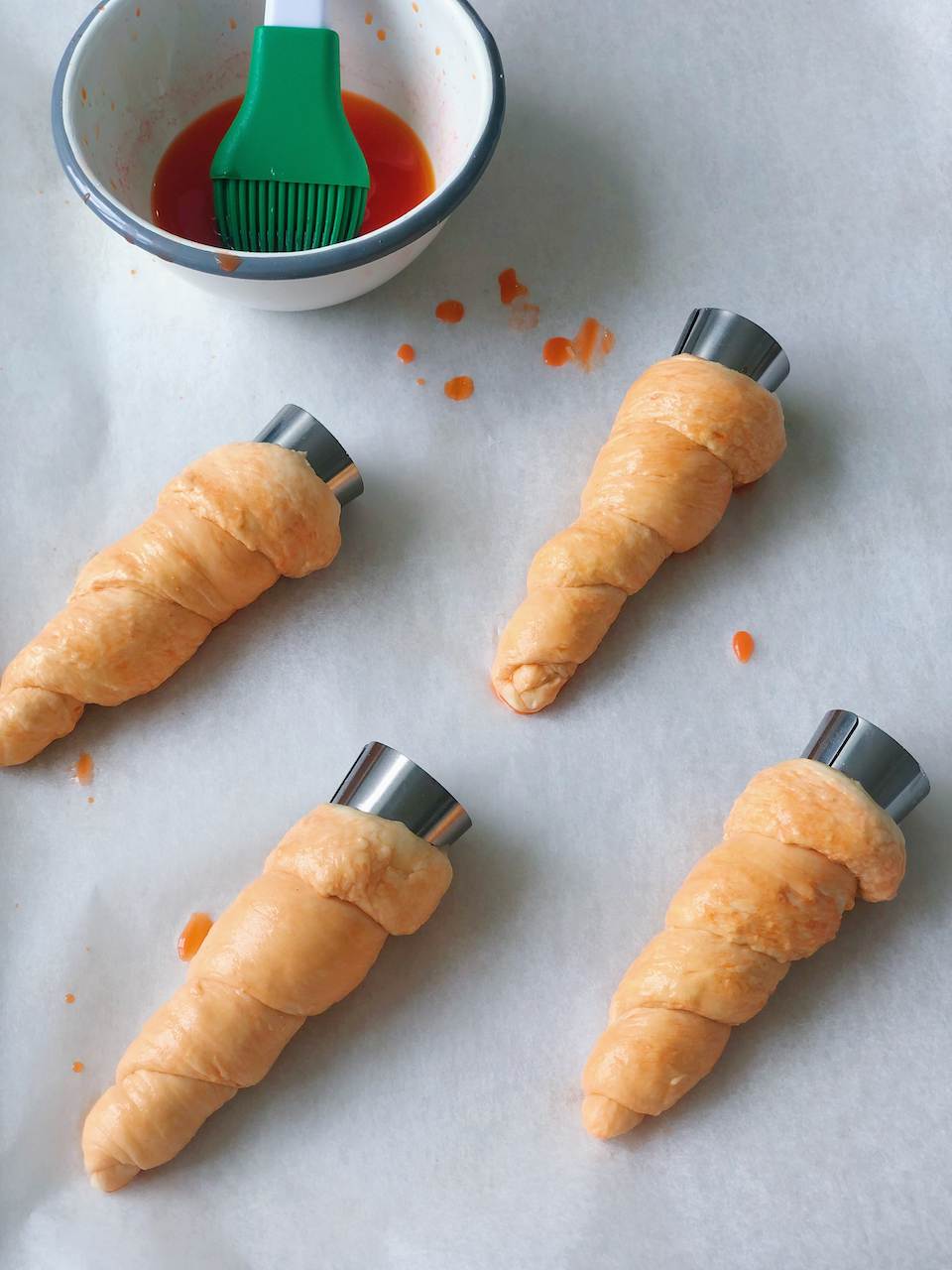 It also helps to have parchment for easy clean up. Also, unless you don’t mind having slightly orange fingers, it’s also a good idea to wear rubber or latex gloves to keep your hands clean. Using a silicone brush is the perfect tool for brushing on the orange coloring. Hold the mold with one hand while coloring all sides of the dough. Place it on the parchment to bake with the seam side down to prevent it from unrolling as it bakes.